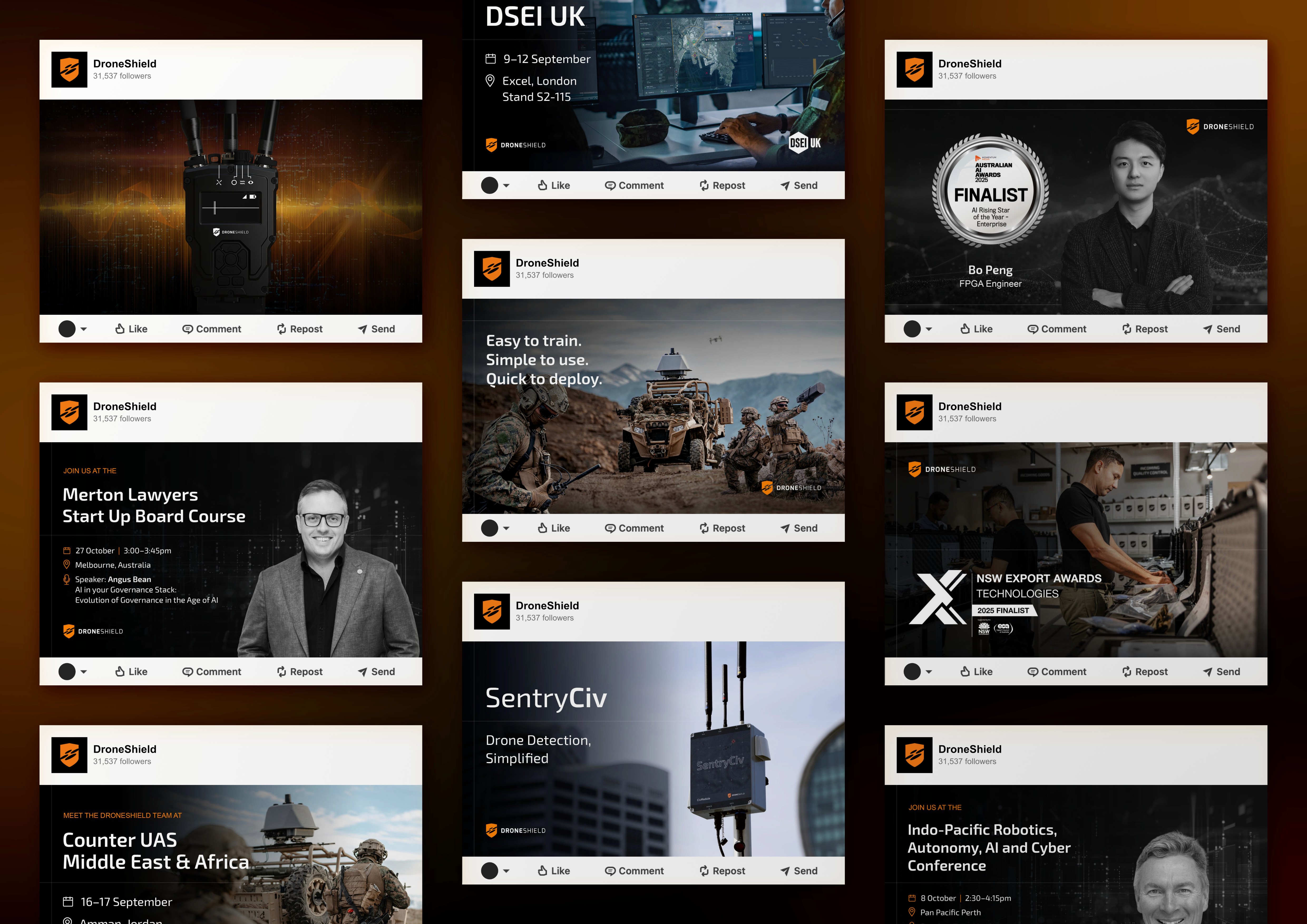 At DroneShield, I acted as a key custodian of the brand identity, responsible for the end-to-end execution of visual communications within a fast-paced and highly technical environment. My role centred on translating sophisticated hardware data and complex regulatory requirements into digestible, brand-aligned formats that maintained technical precision. Working closely with internal stakeholders and the marketing team, I implemented a systems-based approach to ensure that every design solution upheld a unified and professional brand voice across all touchpoints.